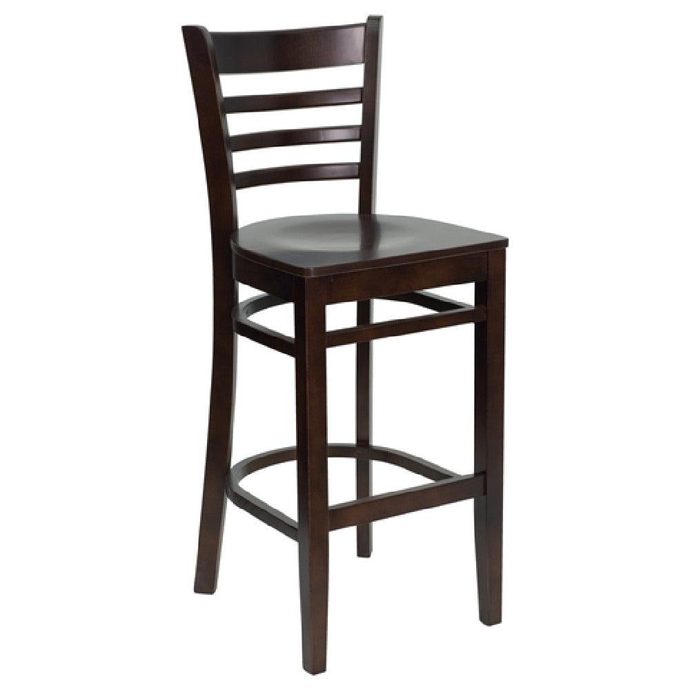 The Flash Furniture XU-DGW0005BARLAD-WAL-GG Hercules Series Restaurant Bar Stool Wood Ladder Back exemplifies commercial-grade seating designed for high-traffic foodservice environments. Crafted with a European beechwood frame finished in walnut, this stool features a 5/8" thick beechwood seat and a distinctive ladder back style. Its mortise and tenon construction, reinforced with metal wood screws, ensures superior durability for constant use in bars, restaurants, and hospitality venues. The inclusion of a footrest enhances user comfort and supports extended seating periods. This model is engineered with precision, offering details such as standing 43.75 inches high and measuring 16.75 inches wide, making it an ideal seating solution for commercial establishments seeking robust, stylish, and functional bar stools optimized for frequent use and easy maintenance.