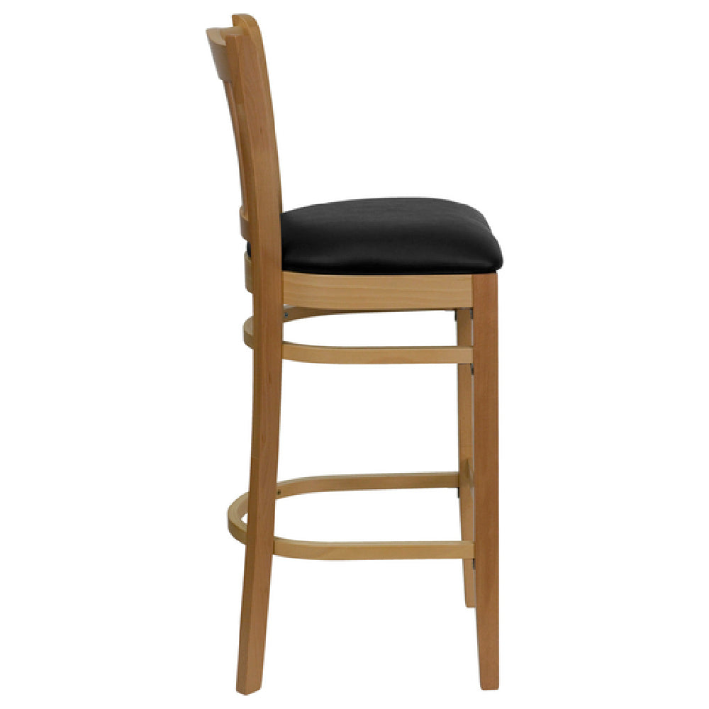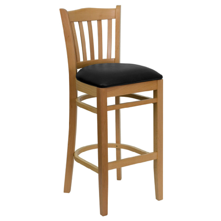 The Flash Furniture XU-DGW0008BARVRT-NAT-BLKV-GG Hercules Series Restaurant Bar Stool is a commercial-grade seating solution engineered for durable indoor use in foodservice environments. Designed with a classic vertical wood slat backrest and a padded vinyl upholstered seat, this bar stool offers enhanced comfort and resilience. Its construction features mortise and tenon joints reinforced with metal wood screws, ensuring stability under moderate workloads. Equipped with a European beechwood frame finished in natural, it complements various hospitality and restaurant settings. With a seat height of 43.75 inches and a width of 17.5 inches, it is tailored for bar-height applications and high-traffic venues requiring reliable furniture, making it suitable for hospitality, café, or casual dining deployments.