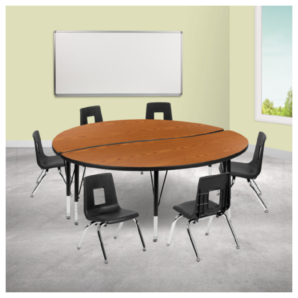 This set features a 60-inch diameter round laminate top with a height adjustable between 16¼ inches and 25¼ inches, supported by 16 gauge tubular steel legs with nylon glides to prevent floor damage. The unit weighs approximately 250.1 lbs and is constructed with a durable laminate surface and corrosion-resistant nickel chrome-plated steel legs. Its design adheres to standard dimensions suitable for diverse indoor settings, with a focus on compatibility and robust use. The assembly process requires no special tools beyond common hand tools, and the set includes six stack chairs with a silver nickel finish and oak/black accents. The furniture's construction resists typical wear from frequent handling, and its height adjustment feature ensures ergonomic comfort for different user groups. Designed for versatility, it seamlessly integrates into various educational and activity-based environments.