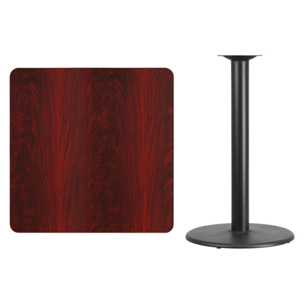 The Flash Furniture XU-MAHTB-3636-TR24B-GG is a commercial-grade indoor square table designed specifically for bar-height applications in foodservice environments. Measuring 36 inches in width and depth with a height of 43-1/8 inches, this table offers a sturdy 1-1/8-inch MDF top with a melamine core, finished in mahogany laminate for durability and aesthetic appeal. Its black PVC T-mold edge enhances impact resistance, making it suitable for frequent commercial use. Equipped with a pre-welded top plate, a 24-inch diameter round base, and a 4-inch cast iron column with a powder-coated finish, it provides stability and resistance to wear. This table is ideal for use in hospitality settings such as bars, cafes, or casual dining areas requiring reliable and stylish furniture with functional technical specs.