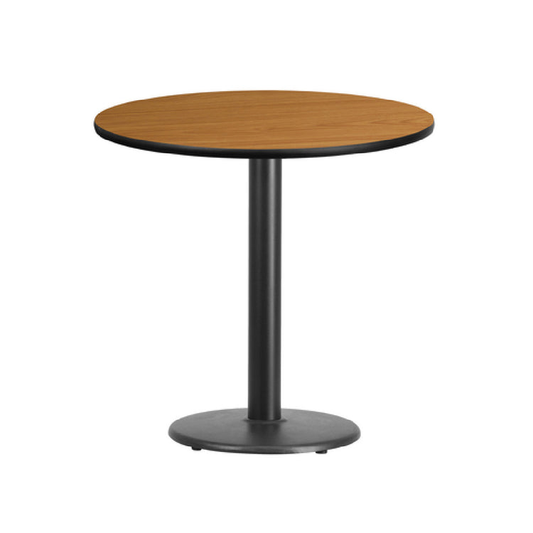 The Flash Furniture XU-RD-30-NATTB-TR18-GG Table 30" Dia. X 31-1/8"H Dining Height is a commercial-grade round dining table designed for high-traffic foodservice environments. Constructed with a 1-1/8" thick MDF tabletop with a melamine core, it offers durability and resistance to wear. Its natural laminate finish provides an attractive aesthetic, complemented by a black PVC T-mold edge for enhanced protection. Equipped with a 18" diameter cast iron base and a 3" diameter black powder-coated steel column, this table offers stability for various hospitality settings, including cafes, restaurants, and catering venues. Precise technical features include a 30" diameter top, 31-1/8" dining height, and a weight of 45 lbs, making it suitable for versatile commercial applications requiring reliable performance and robust construction.