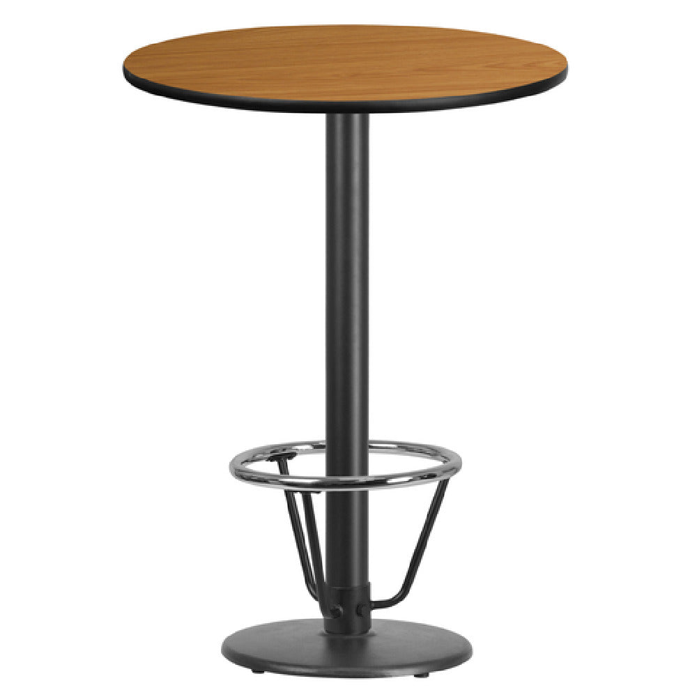 The Flash Furniture XU-RD-30-NATTB-TR18B-3CFR-GG Table is a commercial-grade indoor bar height table designed for high-traffic foodservice environments. Measuring 30 inches in diameter and standing at 43-1/8 inches tall, this round table features a 1-1/8-inch thick MDF top with a melamine core, finished in a natural laminate surface for durability and ease of maintenance. Its sturdy construction includes an 18-inch diameter round base, a 3-inch cast iron column with a black powder-coated finish, and a chrome foot ring with a 16-inch diameter, providing stability and resistance to daily wear. Suitable for hospitality establishments, cafes, or bar areas, this table offers a functional workspace with a sleek design ideal for frequent commercial use.