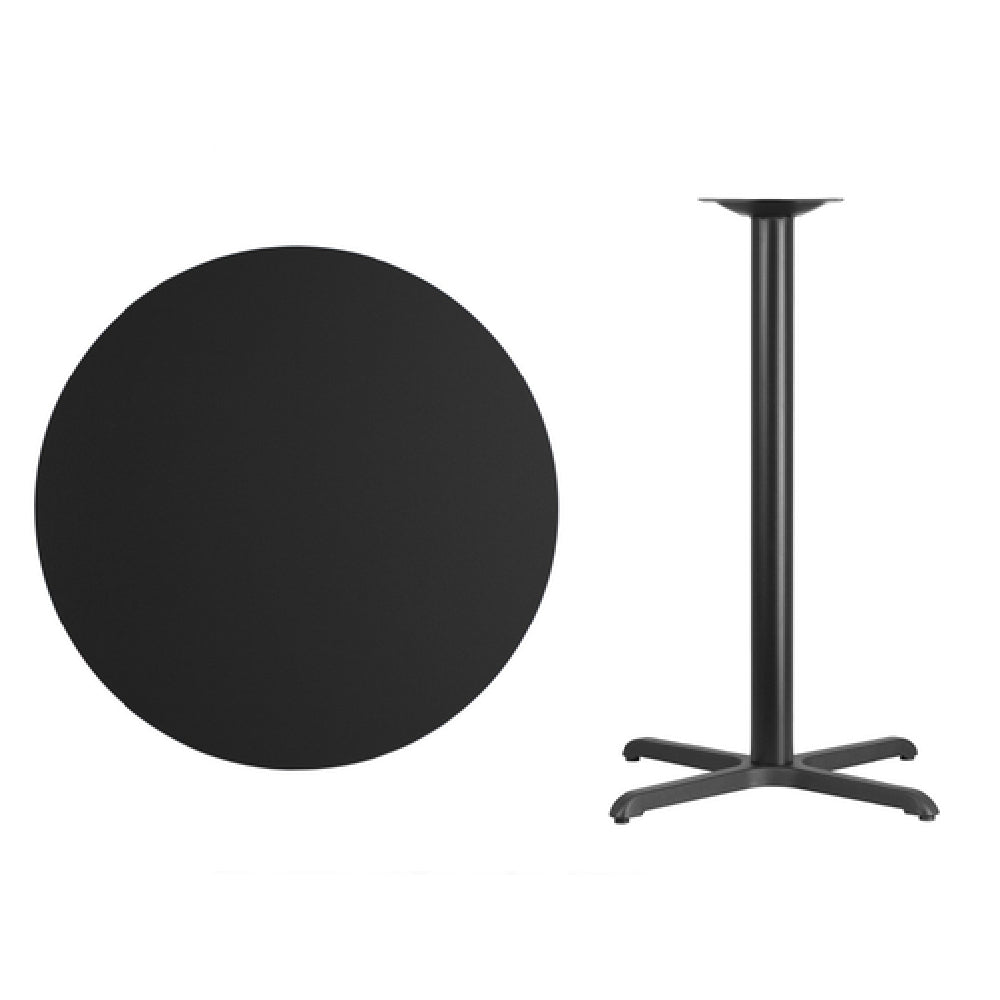 The table features a 36-inch diameter round top constructed from MDF with melamine core and a black laminate finish, providing high resistance to scratching and moisture. Its pedestal base comprises a four-point steel support with a black powder-coated cast iron column standing 42 inches high, aligning with standard bar height. The table weighs approximately 58 pounds and ships in three boxes, with shipping typically occurring within 24 hours. The design does not require electrical connections and emphasizes stability and ease of cleaning in high-traffic areas. Its edge is finished with PVC molding for additional impact resistance, supporting moderate workloads commonly encountered in commercial foodservice environments. No certification labels are specified, but the unit complies with industrial standards for durability and sanitation.