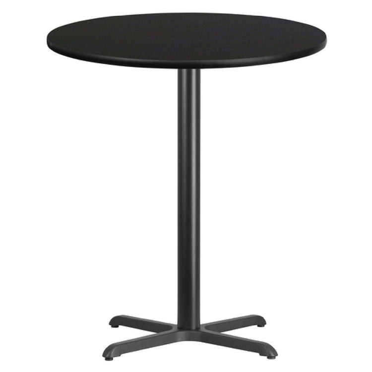 The Flash Furniture XU-RD-36-BLKTB-T3030B-GG Table is a commercial-grade indoor bar height table featuring a 36-inch diameter round top with a 1-1/8-inch thick MDF surface reinforced by a melamine core. Designed for hospitality and entertainment environments, this table accommodates high-traffic settings such as bars, cafes, and casual dining spaces. Its durable black laminate finish and black PVC T-mold edge ensure longevity and resistance to daily wear, while the pre-welded top plate enhances stability during intensive use. The pedestal base supports a 42-inch tall cast iron column with a black powder-coated finish, providing essential stability at standard bar height for professional foodservice applications.
