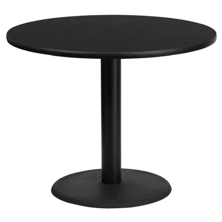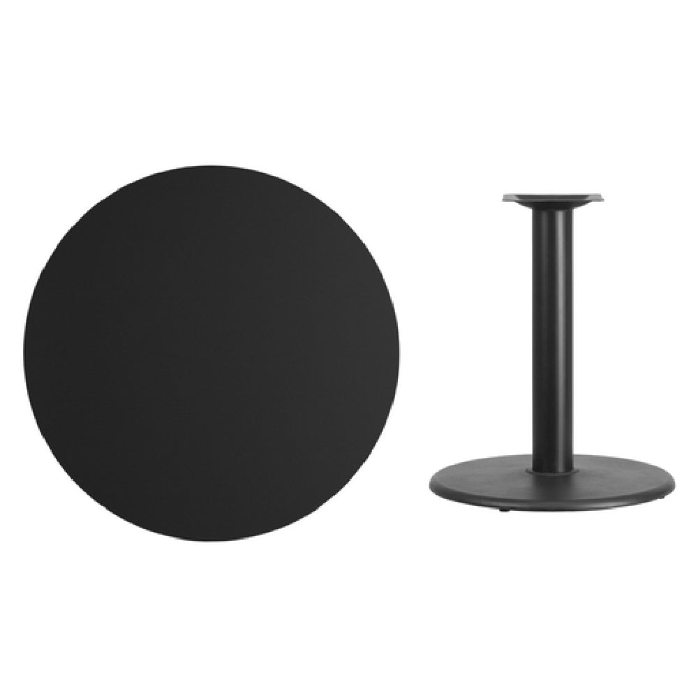 The Flash Furniture XU-RD-36-BLKTB-TR24-GG Table 36" Dia. X 31-1/8"H Dining Height is a commercial-grade round table designed for indoor foodservice environments. Crafted with a 1-1/8" thick MDF top featuring a melamine core and black laminate finish, this table provides a durable surface suitable for high-traffic dining areas. Its black PVC T-mold edge enhances longevity, while the 24" diameter pedestal base offers stability. The 30" high column with a black powder-coated cast iron finish meets standard dining height specifications, making it ideal for restaurants, cafeterias, and catering setups requiring reliable, easy-to-maintain table surfaces. Its technical makeup supports quick cleaning and consistent performance in busy hospitality settings.