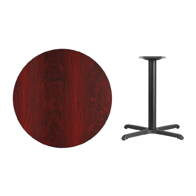The XU-RD-36-MAHTB-T3030-GG table features a 36-inch diameter MDF top with a melamine core and a mahogany laminate finish, resistant to scratches and spills. The 31-1/8-inch height aligns with standard dining parameters, supporting ergonomic seating. Its black cast iron column, measuring 3 inches in diameter, ensures longevity and stability under continuous use. The entire assembly weighs approximately 53 pounds, with a freight class of 70 for shipping. The table does not require electrical components or refrigeration, emphasizing its utility as a straightforward, durable furniture piece. Materials are selected for food safety and ease of cleaning, making it suitable for frequent maintenance routines.