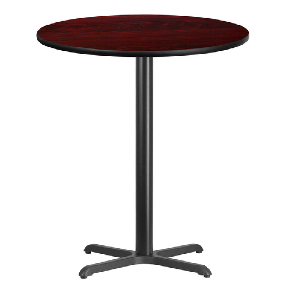 The Flash Furniture XU-RD-36-MAHTB-T3030B-GG Table is a commercial-grade indoor bar-height table designed for versatile seating and counter-style setups in hospitality and foodservice environments. Featuring a 36-inch diameter round top with a thickness of 1-1/8 inches, constructed from MDF with a melamine core and a mahogany laminate finish, it offers durability and ease of maintenance. Equipped with a black PVC T-mold edge, pre-welded top plate, and a sturdy 30 by 30-inch four-point base, this table supports reliable stability. Its 43-1/8-inch height and 3-inch cast iron column with a black powder-coated finish make it suitable for high-traffic commercial settings, including bars, cafes, and entertainment venues. Designed for quick deployment and long-term use, it balances functionality with resilience for demanding hospitality applications.