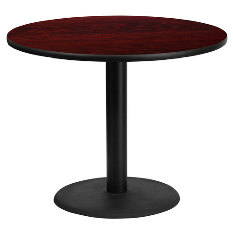 The Flash Furniture XU-RD-36-MAHTB-TR24-GG Table is a commercial-grade round dining table designed for indoor foodservice environments. Featuring a 36-inch diameter and a height of 31-1/8 inches, this model is tailored for seating arrangements in restaurants, cafes, and catering settings. Its 1-1/8-inch thick MDF top with a durable melamine core provides impact resistance and long-term wear, while the mahogany laminate finish offers an attractive, easy-to-clean surface. The black PVC T-mold edge enhances durability, and the pre-welded top plate ensures straightforward setup. Supported by a 24-inch diameter round base and a 4-inch cast iron column with black powder coating, this table combines stability with a sleek appearance, making it an ideal choice for commercial dining scenarios requiring robustness and style.