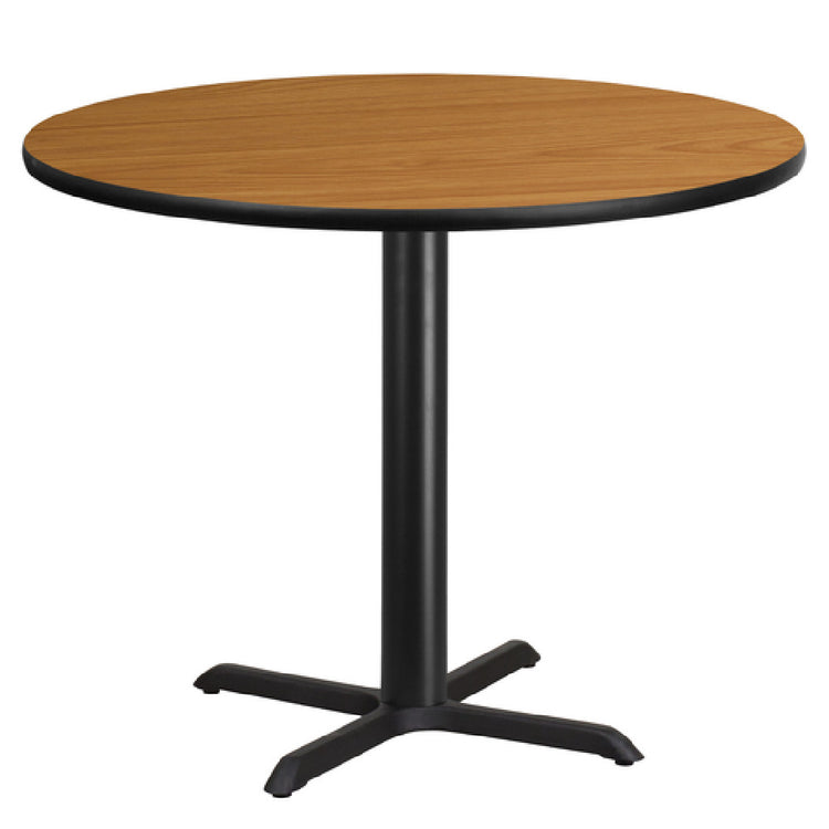 The Flash Furniture XU-RD-42-NATTB-T3333-GG Table is a commercial-grade round dining table designed to meet the demands of professional foodservice environments. Featuring a 42-inch diameter and 31-1/8-inch height, this model offers a stable and durable surface for communal dining settings. The 1-1/8-inch thick MDF top with a melamine core ensures longevity, resistance to scratches, and easy maintenance. The natural laminate finish complements various interior aesthetics, while a black PVC T-mold edge enhances durability. Supported by a robust 33x33-inch pedestal base with a 4-inch cast iron column finished in black powder coating, this table provides excellent stability and strength suitable for high-traffic areas in restaurants, cafeterias, and hotel food courts. Its technical specifications make it a reliable choice for medium-duty commercial use, combining practicality with sophisticated design.