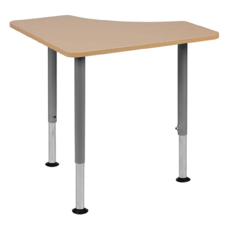 The Billie Triangular Student Desk from Flash Furniture features a durable open-base design with a flat top measuring 32 inches in width, 20-1/2 inches in depth, and adjustable height settings between 24 and 33 inches. Its construction utilizes a 3/4-inch thick thermal fused laminate surface mounted on powder-coated steel legs equipped with floor glides, providing excellent stability and floor protection. The overall weight of the desk is 11.5 pounds, making it sufficiently lightweight for repositioning within classrooms or labs. This model operates without electrical requirements and offers a straightforward setup for seamless integration into institutional furnishings. With an exterior finish in natural tone and a focus on high durability, it suits classroom, training, or laboratory environments where consistent daily use is expected. The construction ensures resistance to common stains and scratches, suitable for rigorous use and easy maintenance.