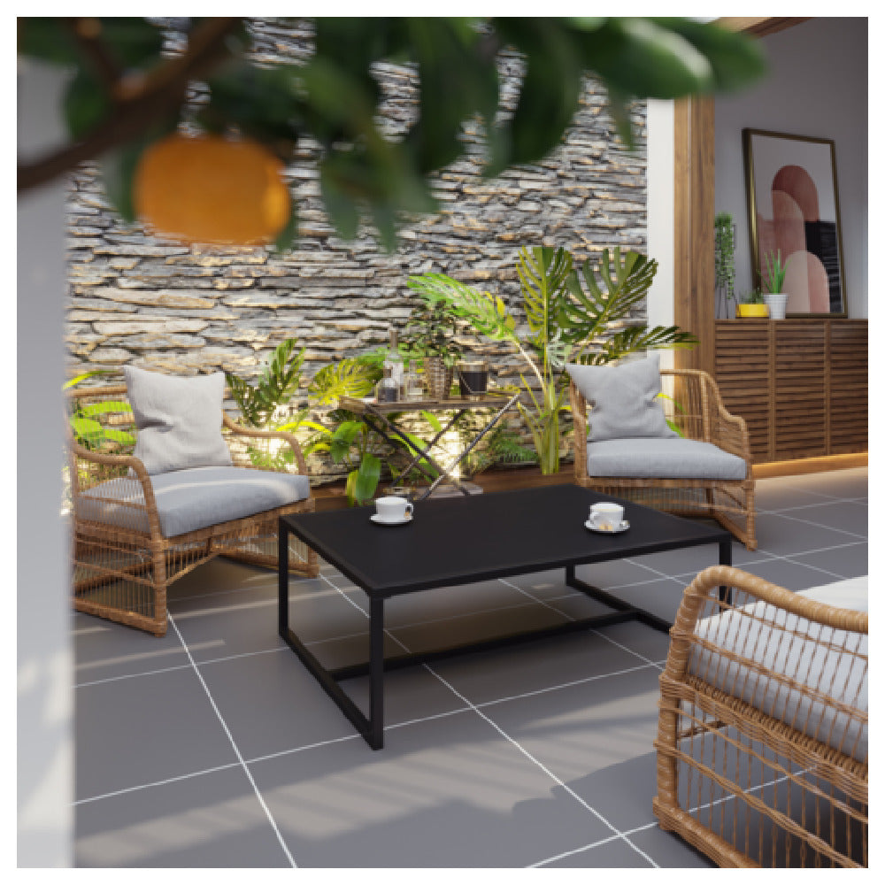 This outdoor patio coffee table features a commercial-grade steel frame with a black finish, designed to withstand outdoor weather conditions. Its square leg design offers enhanced stability, and the tabletop surface is easy to maintain, making routine cleaning straightforward. Ideal for outdoor cafes, hotel patios, or poolside lounges, the table’s robust construction supports frequent use and heavy loads. Designed for quick placement and durability, it integrates seamlessly into high-traffic outdoor environments to improve workflow and customer experience.