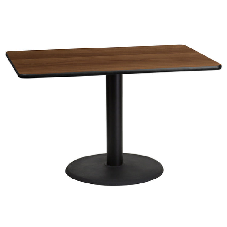 The Flash Furniture XU-WALTB-3048-TR24-GG rectangular table is a commercial-grade indoor dining surface designed for restaurant, cafe, or hospitality environments. Measuring 48 inches wide by 30 inches deep and standing at a height of 31-1/8 inches, this table features a durable MDF top with a melamine core, topped with walnut laminate finish for an attractive and resilient surface. Its 1-1/8-inch thickness enhances stability and impact resistance, while the black PVC T-mold edge provides additional protection against dings and scratches. Equipped with a pre-welded top plate, a 24-inch diameter circular base, and a 4-inch cast iron column with a black powder-coated finish, this table offers balanced support suitable for various commercial settings. It is optimized for high-traffic environments needing reliable, easy-to-maintain furniture, with quick ship options generally available within 24 hours.