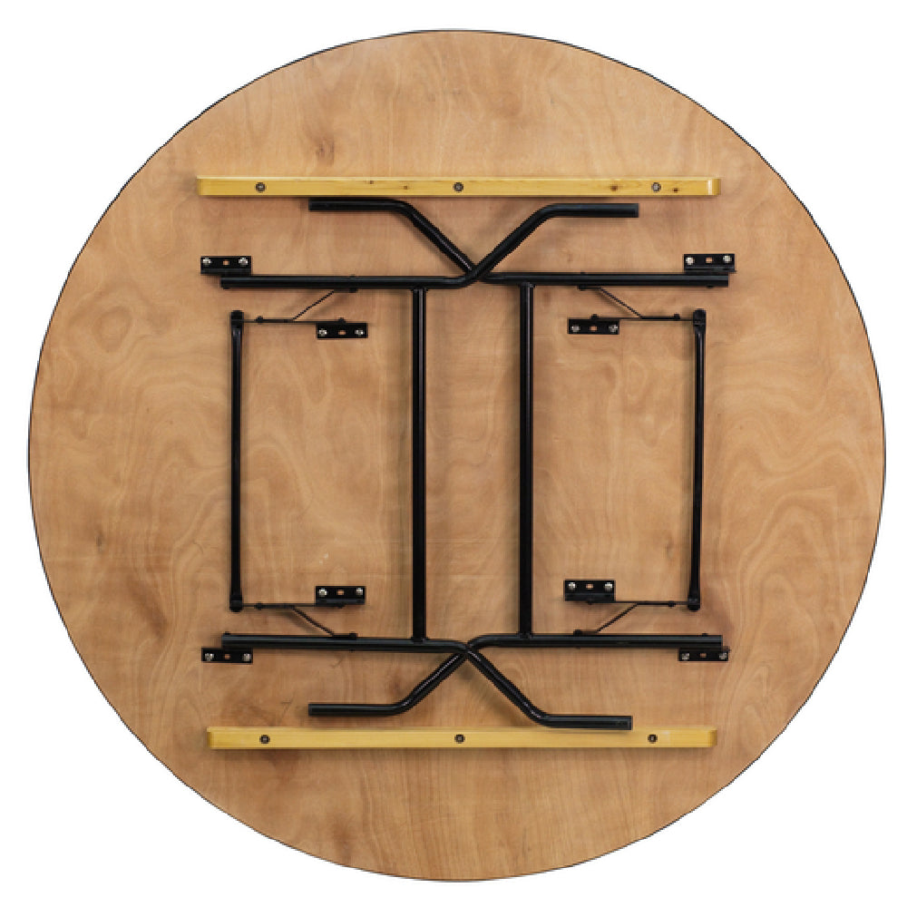 The Flash Furniture YT-WRFT60-TBL-GG folding table features a full circle 60-inch diameter plywood surface with a vinyl-coated edge, supported by a steel wishbone frame finished in corrosion-resistant black powder coating. Its weight is approximately 54 lbs, designed for commercial use with a static load capacity of 992 pounds. The table requires no electrical connections, has an overall height of 30 inches, and is constructed for stability and longevity in high-traffic environments. Maintenance involves routine cleaning of the plywood surface and periodic checks of fold hinges and protective caps to ensure continuous safe operation. The compact 60-inch diameter allows for versatile placement in various venues, while foldability facilitates efficient storage and transport.