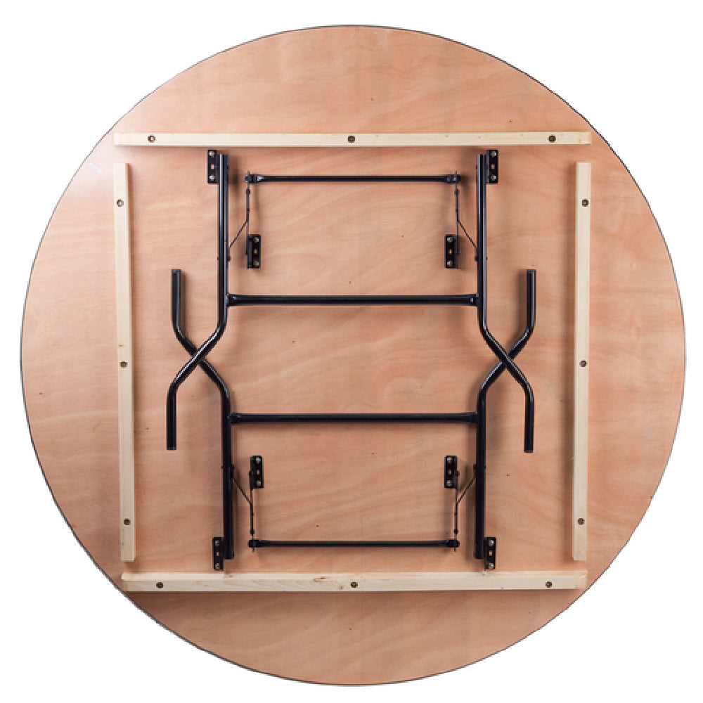 This folding banquet table features a 66-inch diameter round plywood top with a sealed veneer finish, mounted on 18-gauge steel wishbone legs finished in a black powder-coat for corrosion resistance. It weighs 65 lbs and can support a static load of 1000 lbs, with a freight class of 125. The table is fabricated for long-term usability, with a temperature operating range suitable for typical indoor environments. Its dimensions are 66 inches across and 30 inches high, with construction focused on stability and ease of cleaning. The table’s food contact surfaces are compatible with standard cleaning routines, and its lightweight design facilitates quick setup and breakdown in busy kitchen or event workflows.