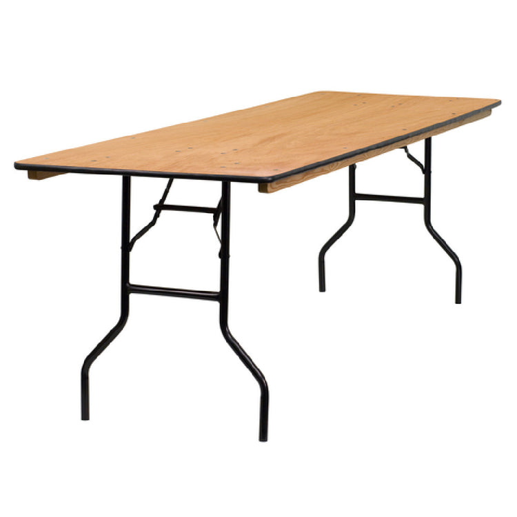 The Flash Furniture YT-WTFT30X96-TBL-GG Folding Banquet Table is a commercial-grade rectangular table designed for versatile use in foodservice environments. Measuring 96 inches wide by 30 inches deep and standing at 30-1/4 inches high, this table is constructed with a 1/2-inch thick plywood top and a durable clear coat finish, providing a smooth, resilient surface suitable for catering, buffets, and event setups. Its black PVC T-mold edge enhances durability and aesthetics, while the 18-gauge steel wishbone legs with black powder coating ensure stability and longevity under frequent use. Capable of supporting a static load capacity of 661 pounds, it efficiently accommodates up to 10 adults, making it an ideal solution for large-scale foodservice operations requiring reliable, portable table options.