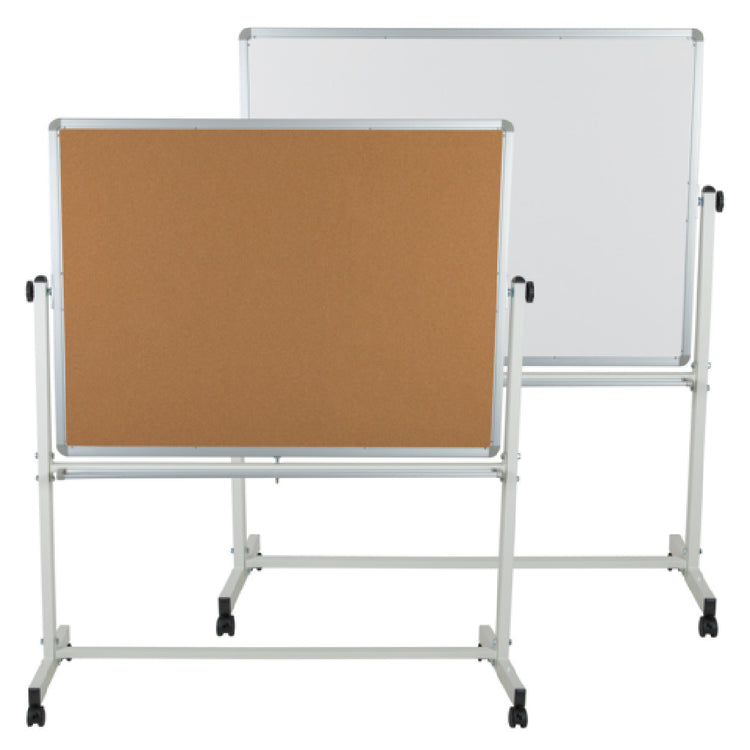 Designed for professional environments, this 53" wide by 62-1/2" tall mobile marker and cork board combines a lacquer painted magnetic surface with self-healing cork backing, ensuring longevity and easy maintenance. Its aluminum frame enhances sturdiness, while the removable pen tray and spring clip offer expedient access and secure attachment of writing tools and accessories. The dual caster wheels enable smooth repositioning across floors, optimizing workflow in conference rooms, classrooms, and collaborative spaces. The reversible design allows seamless switching between whiteboard and cork surface, supporting diverse communication and display needs. Precise dimensions, such as a 20-inch depth and 48-pound weight, make it adaptable for various commercial applications.