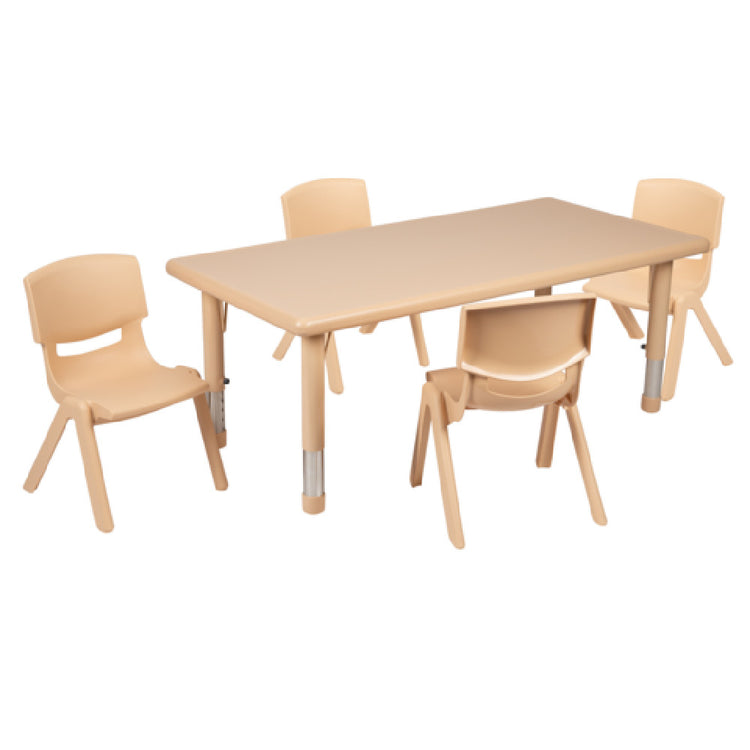The Flash Furniture YU-YCX-0013-2-RECT-TBL-NAT-R-GG preschool activity table set is a commercial-grade indoor furniture solution designed for educational and childcare environments. This set includes a rectangular table measuring 48 inches in width, 24 inches in depth, and an adjustable height ranging from 14-1/2 inches to 23-3/4 inches. Constructed with a durable plastic top and safety-rounded corners, it supports a static load capacity of up to 220 pounds, ensuring stability during active use. The extending steel legs facilitate height adjustment for ergonomic adaptability, making it suitable for diverse preschool activities and collaborative learning settings. The set also features four lightweight stacking school chairs with contoured polypropylene shells and 10-1/2-inch seat height, capable of supporting up to 154 pounds each, optimized for space-saving storage and frequent cleaning. This product is ideal for classrooms, daycare centers, and early childhood education facilities seeking reliable, versatile furniture for dynamic early learning environments.