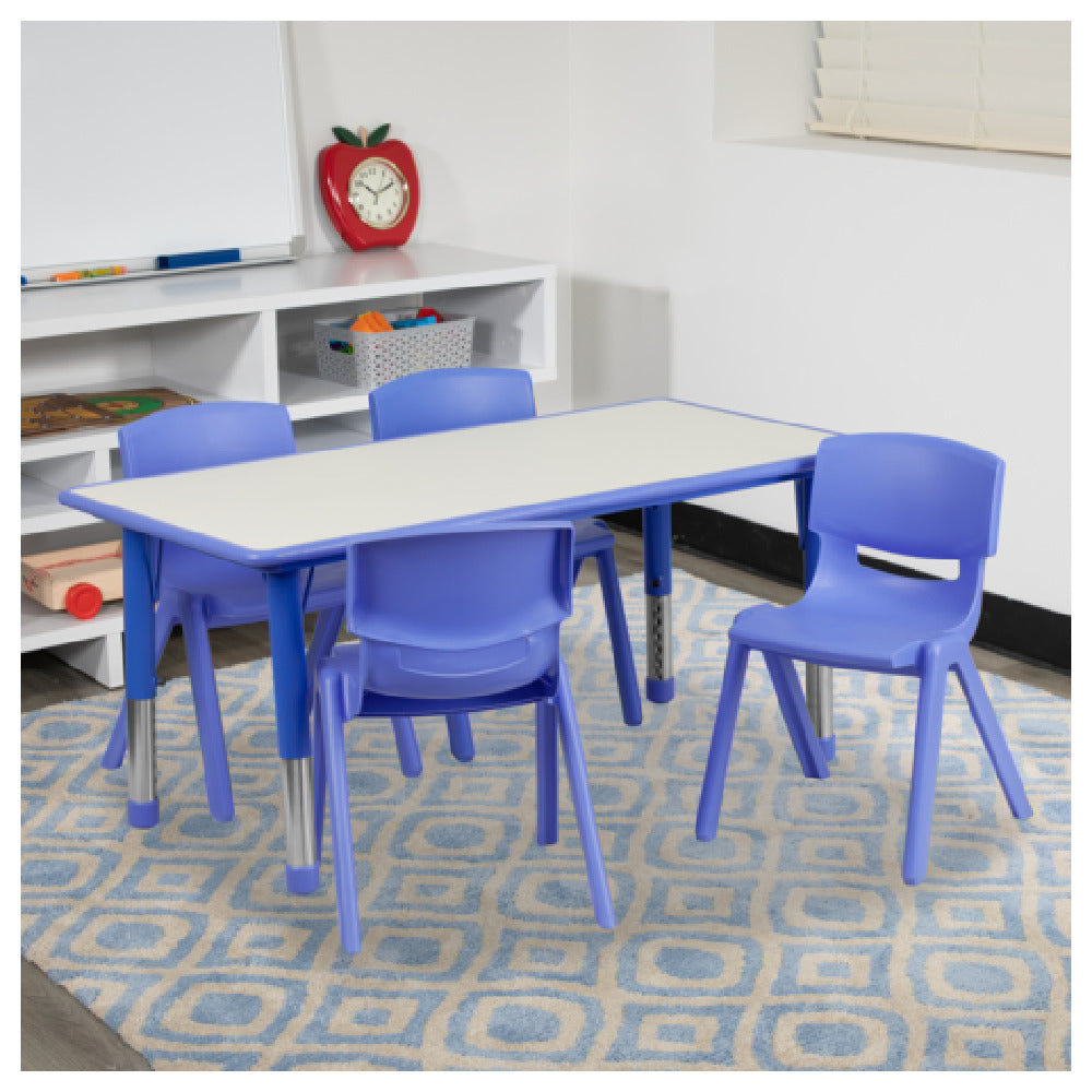 The Flash Furniture YU-YCY-060-0034-RECT-TBL-BLUE-GG Preschool Activity Table Set is a comprehensive indoor classroom furniture solution designed for early childhood education environments. This set features a rectangular table with dimensions of 47-1/4" W x 23-5/8" D, and an adjustable height range from 14-1/2" to 23-3/4", enabling ergonomic flexibility for various age groups and activities. Built with a 1" thick laminate top and safety-rounded corners, it provides durability and child-safe design. The steel extending legs support static loads up to 220 lbs., making it suitable for active use. The set also includes four stacking school chairs, each with a 10-1/2" seat height and a static load capacity of 154 lbs., featuring contoured polypropylene shells for lightweight, durable seating. This product supports classroom productivity and safety compliance in early learning settings through its sturdy construction and ergonomic features.