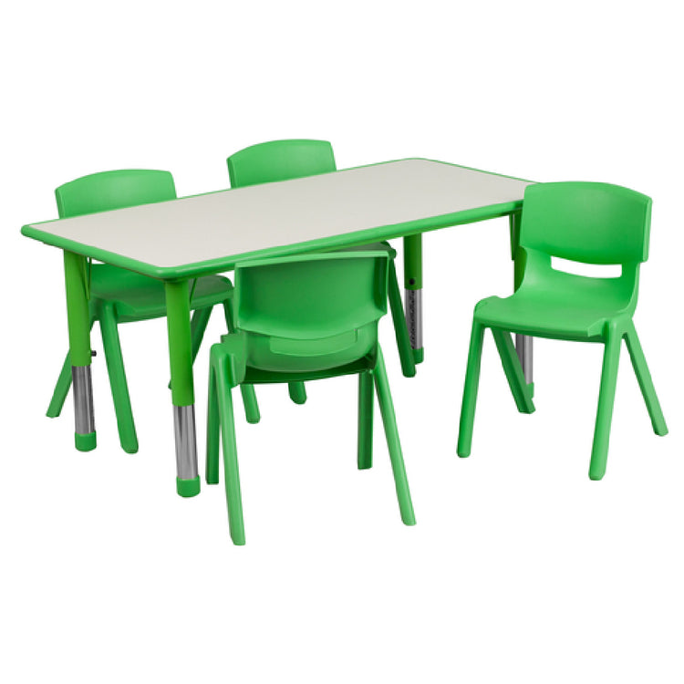 The Flash Furniture YU-YCY-060-0034-RECT-TBL-GREEN-GG preschool activity table set comprises a rectangular table with a 47-1/4" width and 23-5/8" depth, featuring an adjustable height range from 14-1/2" to 23-3/4". The 1" thick laminate tabletop is reinforced with a plastic edge and rounded safety corners to enhance durability and child safety. Accompanying are four stacking school chairs, each with a 10-1/2" seat height, supporting static loads up to 154 lbs. The steel legs extend for stability and allow stacking of up to ten chairs for efficient storage. Ideal for early childhood education environments, this set provides a sturdy, lightweight solution designed for frequent, multi-user use. It integrates seamlessly into preschool classrooms needing dependable furniture with easy maintenance and space optimization. The set ships in two boxes, with assembly required, aligning with institutional specifications for durable, versatile furniture supporting high-volume activity stations.