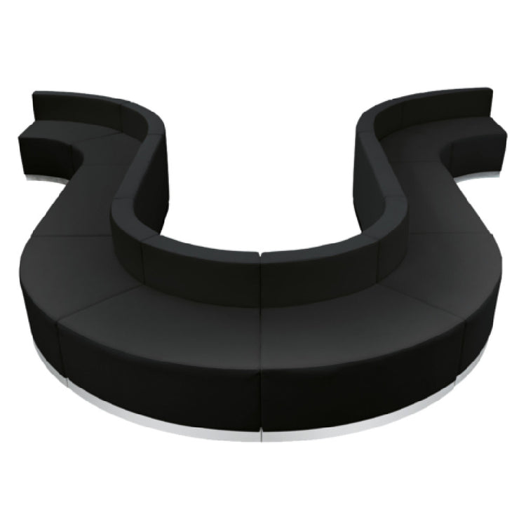 The Flash Furniture ZB-803-440-SET-BK-GG Hercules Alon Series Reception Configuration is a modular commercial seating system designed for professional applications such as office reception areas, hospitality lobbies, and corporate waiting zones. This high-density setup combines four concave and four convex leatherSoft-upholstered chairs, along with two spacious loveseat units, to create a flexible and inviting waiting environment. With overall dimensions of approximately 158-1/2 inches in width and an adjustable depth ranging from 25-1/4 to 156 inches, this configuration offers a durable, stylish, and functional solution. The set features line-stitched, taut seat and back surfaces with CA117 fire-retardant foam, all mounted on brushed stainless steel bases with adjustable floor glides. The locking bolts facilitate secure and stable installation, ensuring safety and longevity in high-traffic commercial settings.