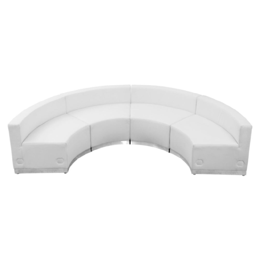 Flash Furniture, ZB-803-480-SET-WH-GG, Hercules Alon Series Reception Configuration, 105"W x 25-1/4" to 52-1/2"D x 27"H overall dimensions, includes: (4) 21-1/2" to 41-1/2"W x 25-1/4"D x 27"H concave chairs, modular, LeatherSoft upholstery, taut seat and back, line stitching throughout, CA117 fire retardant foam, locking bolt connects chairs, brushed stainless steel base, adjustable floor glides, white (assembly required) (shipped in 4 boxes) (in stock items usually ship within 24 hours)