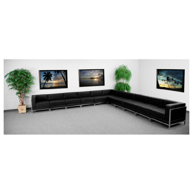 The Flash Furniture ZB-IMAG-SECT-SET2-GG Hercules Imagination Series Sectional is a modular indoor sofa seating solution designed for commercial environments requiring versatile and durable lounge furniture. This 11-piece sectional spans 169 inches in width with adjustable depth ranging from 28-3/4 inches to 169 inches, and stands 27-1/2 inches high. Constructed with fixed cushions, a smooth back, and exposed stainless steel accents, it features black LeatherSoft upholstery with stainless steel legs, tailored for high-traffic hospitality, lounge, or waiting areas. Combining high-quality materials and precise dimensions, this sectional optimizes seating capacity while maintaining a contemporary aesthetic suitable for professional spaces.
