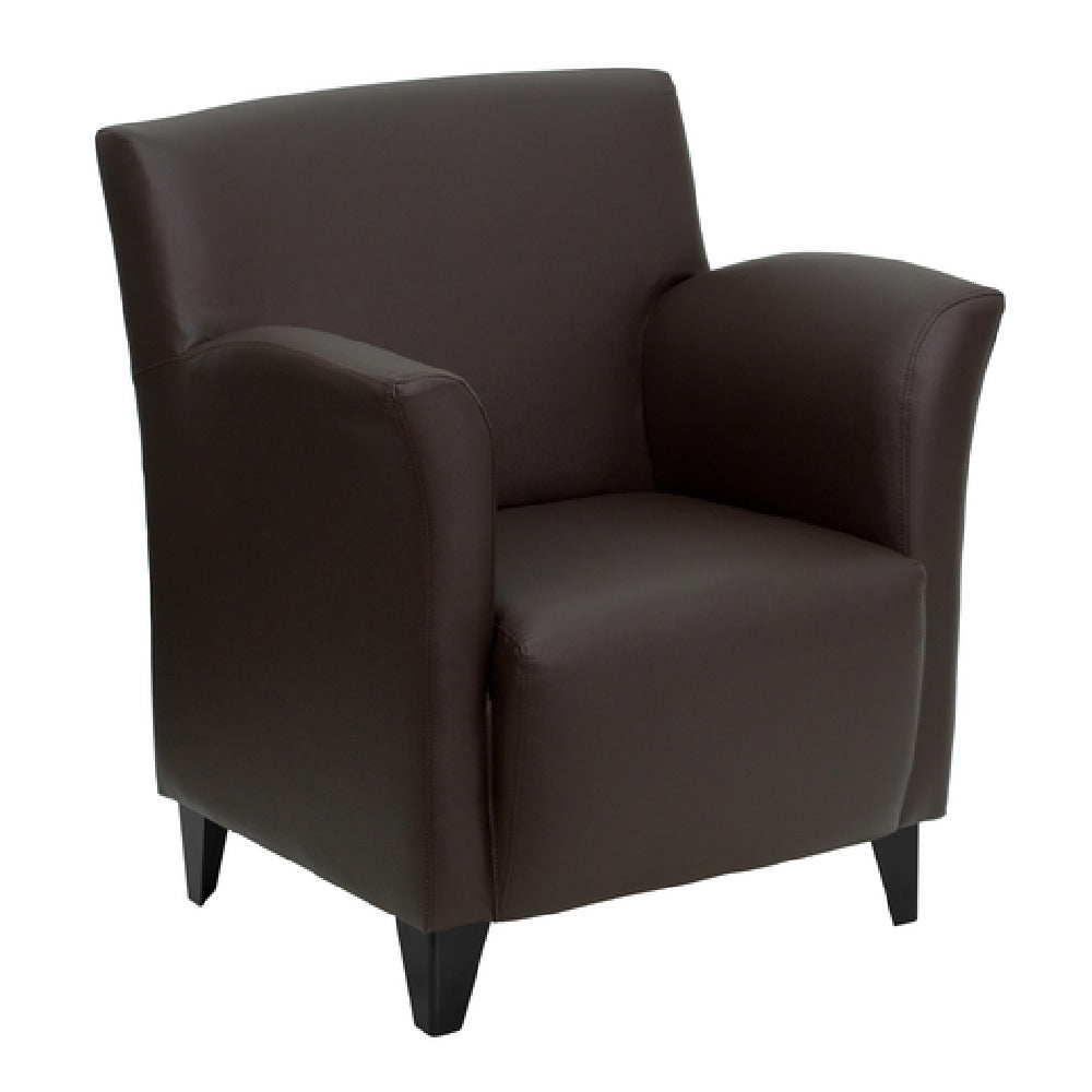 The Flash Furniture ZB-ROMAN-BROWN-GG Hercules Roman Series Reception Chair with Flared Arms embodies a blend of classical design and industrial-grade materials suited for high-traffic commercial environments. This indoor lounge chair features a sturdy steel frame with black metal feet, upholstered in durable LeatherSoft foam that adheres to CA117 flame retardant standards. Measuring 34 inches in height, 30 inches in width, and 27 inches in depth, it is engineered for comfort and longevity in reception areas, waiting rooms, and hospitality spaces. Its taut seat and back provide ergonomic support, making it suitable for prolonged seating, while its construction supports demanding commercial use. This model's technical specifications cater to professional interior design implementations in high-volume settings requiring resilient and easy-to-maintain furniture.