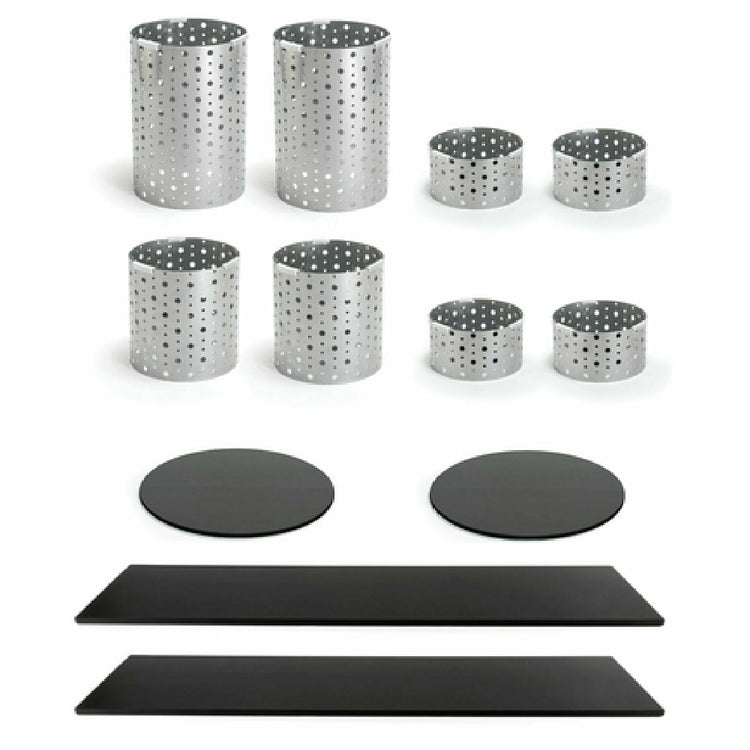 FOH®, BST023MUM28, Buffet Essentials - Dots - Black Bamboo on Silver, includes two BRI004BCI20 Dots Risers - Set of 4 - Silver, two BHO056BKW20 36" x 14" Bamboo Board - Black, and four BHO058BKB20 14" Round Bamboo Board - Black [Kitted] (Packed By: 1 Each)