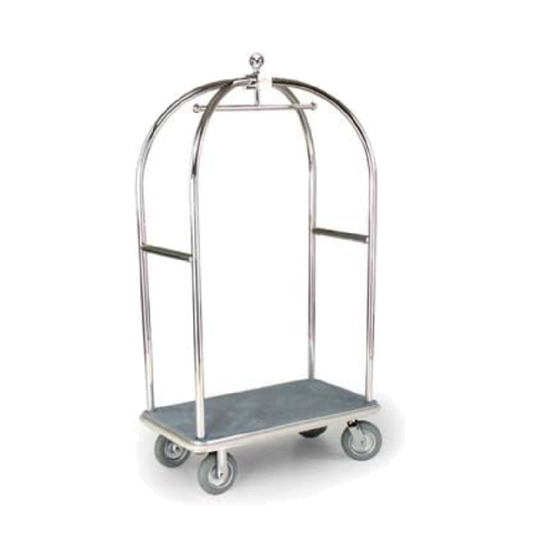 Forbes Industries, 2419, Birdcage® Luggage Cart, 1-1/2" dia. tubular superstructure, polished brass, (2) 1-1/2" dia. push bars, carpeted deck, solid brass skirt, full wrap-around bumper, 8" dia. grey cushion non-marking wheels in brass plated caster forks