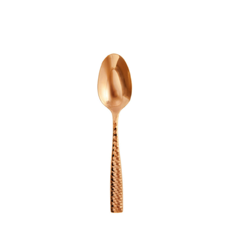 A commercial soup and dessert spoon is a professional-grade flatware piece designed for serving liquids and delicate dishes in foodservice environments. Crafted from durable stainless steel, it is suitable for frequent dishwashing and high-volume use. The Fortessa Lucca Faceted Copper Rose Dessert/Oval Soup Spoon measures 7.1 inches (18.1 cm), ideal for precise and elegant presentation of soups, desserts, and bouillons in upscale restaurants, hotels, and catering operations, especially those emphasizing refined tableware for mid-volume service environments.
