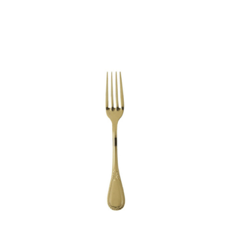 The Fortessa 1.9.210.00.012 Salad/Dessert Fork features a length of 7 to 8 inches, crafted from high-grade 18/10 stainless steel with a finished weight of 0.11 pounds per piece. Its dimensions include a width of 1 inch, depth of 7.12 inches, and height of 1.06 inches, ensuring comfortable handling and presentation. The material offers excellent corrosion resistance and a polished gold finish that withstands frequent dishwashing cycles. It is built for moderate throughput settings such as upscale restaurants, banquet halls, and catering services, where durability and visual appeal are critical. Its design supports efficient stacking and storage, with disassembly compatible for thorough cleaning. The flatware complies with safety standards related to food contact, without requiring electrical or cooling components.