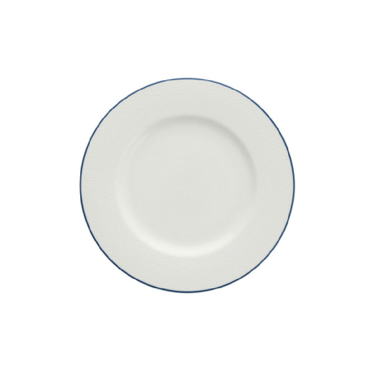 The Fortessa Amanda Dinner Plate model 7004.FFD.10 is built with a flat edge round shape using high-quality vitrified China, ensuring long-term durability and stain resistance. Measuring 10.75 inches in diameter with a height of 2.2 inches, it features an embossed surface for both enhanced grip and presentation. It operates in standard commercial kitchen environments, with safe temperature tolerance up to 400°F and suitability for dishwasher and microwave sterilization. Its white finish with a subtle blue edge provides a refined look suitable for diverse dining atmospheres, from casual to fine dining, with optimal stacking and handling features to maximize efficiency during service.
