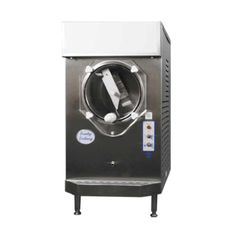 The Frosty Factory 235R 3/1 Frozen Beverage Machine Counter Model with Remote Condenser is a commercial-grade non-carbonated cylinder type frozen drink machine designed for high-volume beverage service environments. Featuring a robust stainless steel finish, this unit incorporates a single-flavor dispensing system with three separate nozzles, a 12 qt. hopper and freezing cylinder, and a 320 ten-ounce drinks/hour output capacity. Its remote refrigeration system ensures consistent cooling performance, ideal for busy hospitality venues requiring reliable frozen beverage production and presentation. Equipped with high-efficiency components such as a 3 HP compressor and R404A refrigerant, the model addresses intensive daily operations while maintaining sanitation and energy efficiency. Precise technical aspects include a 16.5" width, 26" depth, 32" height configuration, and a weight of 660 lbs, suitable for countertop integration in commercial settings.