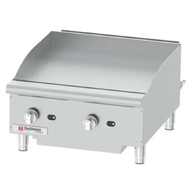 The Grindmaster Cecilware GCP24 GRINDMASTER Cooking Cecilware® Pro Griddle Gas is a commercial-grade countertop cooking appliance designed for high-performance foodservice environments. It features a 24-inch wide by 20-inch deep cooking surface with a robust 1-inch thick steel griddle plate, facilitating uniform heat distribution. Equipped with two stainless steel burners rated at 30,000 BTU/hr each, the unit delivers a combined 60,000 BTU/hr, suitable for medium-volume applications. Its manual controls allow precise temperature adjustments, while independent cooking zones enable simultaneous preparation of different foods. Constructed entirely from stainless steel, this griddle offers durability, longevity, and ease of maintenance, making it an essential component in professional kitchens requiring reliable, efficient gas cooking solutions.