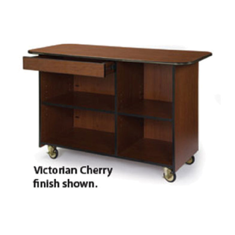 The Geneva 68110 Service Cart Enclosed is a commercial-grade dining room service and display cart designed for efficient storage and transport in foodservice environments. Measuring 57-1/2 inches wide by 25-1/2 inches deep and standing at 36-3/4 inches overall height, this cart features a dual-compartment enclosed design with a 47-inch interior width, offering organized space for dishes, supplies, and equipment. Crafted from laminate with high impact edge trim, the cart provides durability and ease of maintenance, suited for mid-volume restaurant, cafeteria, or hospitality operations requiring robust storage solutions that facilitate efficient workflow and sanitation standards.