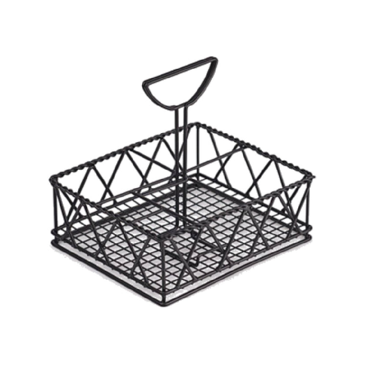 This condiment caddy is constructed from high-grade iron with a black powder coating, ensuring a durable and corrosion-resistant surface. The unit measures 9 inches in width, 7 inches in depth, and 8 inches in height, with a net weight of 23.28 pounds. Its five compartments are precisely dimensioned to standard condiment containers, supporting quick refilling and cleanup. The product fits seamlessly into countertop setups, accommodating heavy daily use without degradation. Designed for commercial kitchen environments, it maintains safe, food-grade standards, contributing to hygienic operation where frequent sanitization is critical. The caddy does not include electrical requirements or refrigeration features, as it is solely a storage rack.
