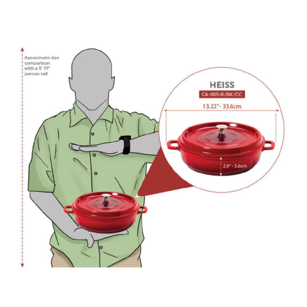 This Heiss™ Braiser Pan is equipped with features tailored for commercial kitchens, including a cast aluminum construction for robust performance and efficient heat distribution. Its induction compatibility allows seamless integration with modern cooking appliances. Designed for ease of maintenance, the pan’s ceramic enamel coating resists chipping and staining, enabling straightforward cleaning. The 3-quart capacity supports moderate-volume batch preparation, suitable for diverse cooking tasks. Its heat resistance up to 500°F ensures safe oven transfer, while the included lid aids in moisture retention, enhancing braising and slow-cooking workflows for foodservice operations.