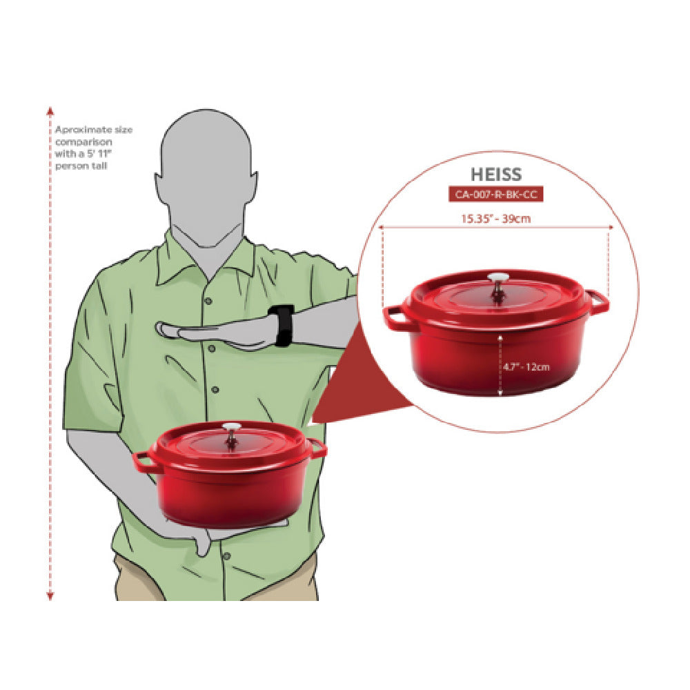 The GET Heiss™ Induction Dutch Oven features a cast aluminum body with dimensions of 11 inches in diameter and 4-1/2 inches in height, weighing approximately 4.95 lbs. Its construction supports a maximum temperature of 500°F, suitable for oven, induction, gas, and electric use, ensuring consistent performance across multiple heat sources. The ceramic enamel coating enhances stain and chip resistance, facilitating straightforward cleaning and long-term durability. Built with a clear finish exterior in orange and a black interior, this cookware is compatible with dishwasher cleaning protocols. It measures 12.13 inches in height including the lid, with overall dimensions optimized for standard kitchen workflows and integrated storage solutions.
