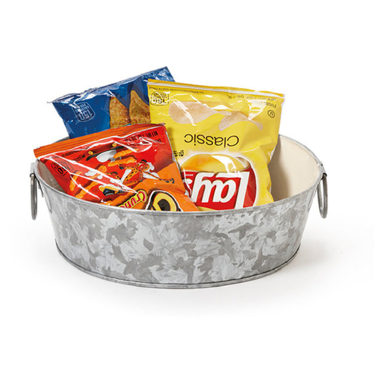 The GET Enterprises GT-1090-GG/IV Tray is a durable, professional-grade metal serving and display tray designed specifically for high-demand foodservice environments. Measuring 10-1/2 inches in diameter and 3 inches high, this round tray features galvanized metal construction with an ivory powder-coated interior for enhanced corrosion resistance and visual appeal. Equipped with drop loop handles for secure handling, it provides a practical solution for presenting and transporting food items in commercial kitchens, catering operations, and buffet setups. Its robust build and ergonomic design support frequent use while maintaining sanitation standards, making it ideal for operational efficiency in hospitality and institutional foodservice settings.