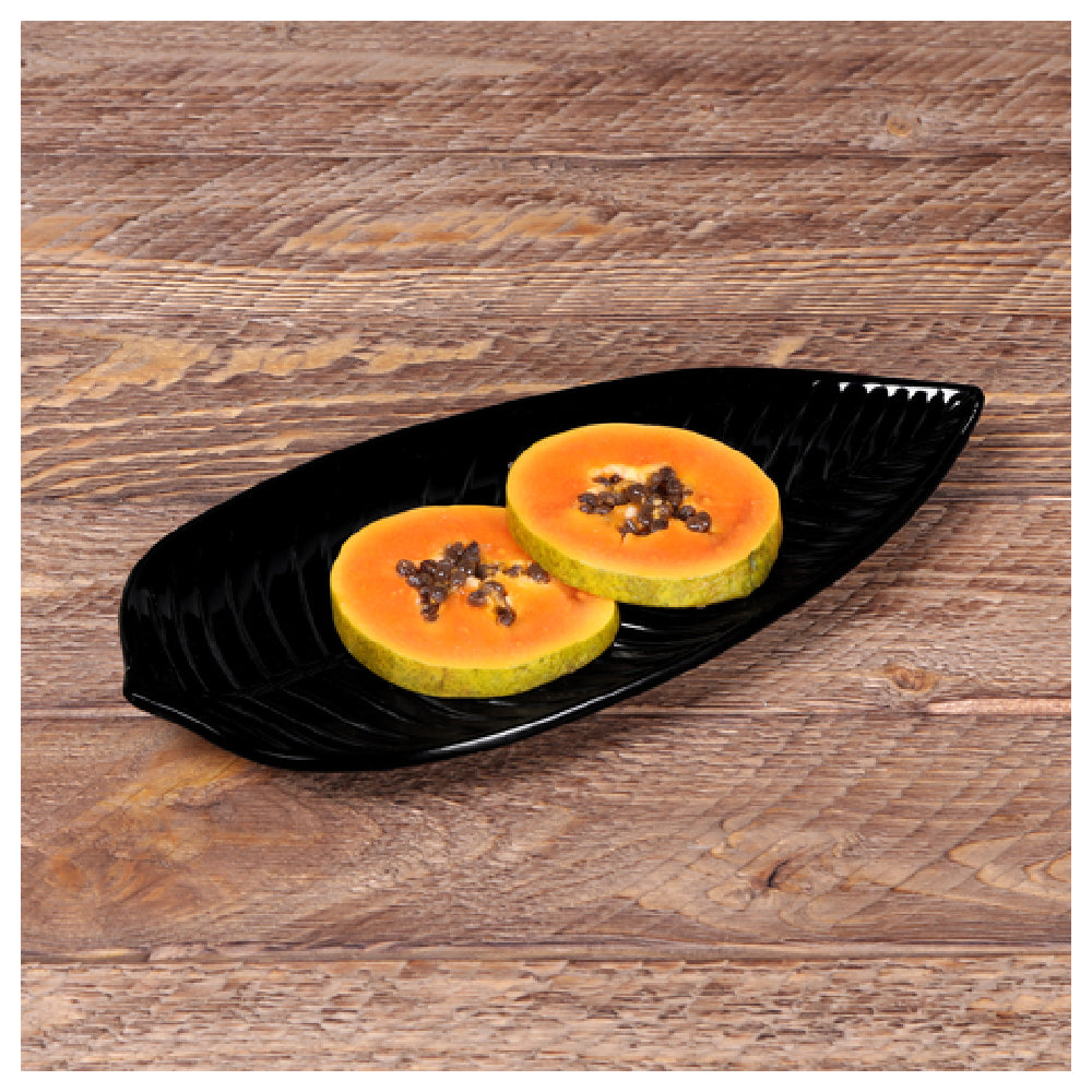 The G.E.T. M105PL-B Elite Global Solutions Platter utilizes BPA-free melamine with dimensions of 10-1/4 inches in length, 5 inches in width, and 1 inch in height. It weighs 2.8 pounds, supporting moderate load capacity suitable for a variety of food presentations. The platter is dishwasher safe, making it easy to clean after use in busy foodservice environments. Its leaf shape adds visual interest while maintaining a compact footprint for efficient storage and service. The product's construction emphasizes durability and resistance to common kitchen hazards like staining and scratching, conforming to commercial food safety standards. The neutral black color enhances integration into various aesthetic themes, ensuring versatile application.