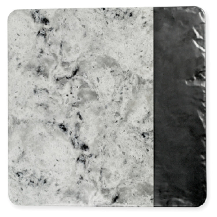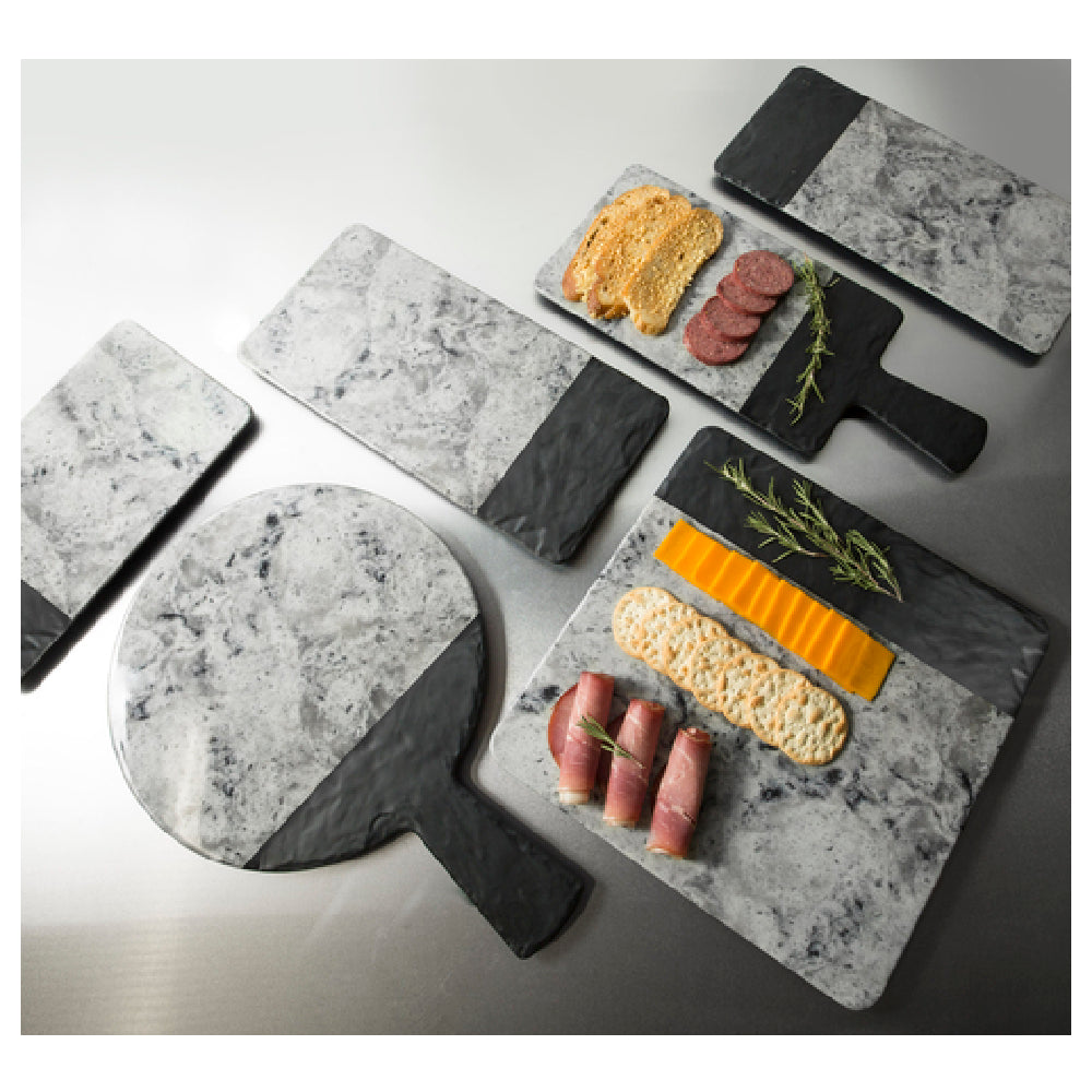 The M13SM-BH melamine serving board from GET Enterprises is manufactured from high-quality melamine material, featuring a square shape with dimensions of 13 inches by 13 inches and a height of 5/8 inches. It weighs approximately 10.9 pounds, ensuring stability during use while maintaining light handling and transport. The surface features a black slate and faux horizon marble look, providing an elegant presentation aesthetic. Designed for commercial kitchen environments, it tolerates dishwasher cleaning, making sanitation routines straightforward. The product's construction is BPA free, supporting food safety standards, with an operating temperature resistance suitable for typical foodservice environments. Its overall compatibility with standard dishwashing equipment and durable material properties make it an efficient choice for medium-volume foodservice operations. The unit does not include handles but offers a flat, sturdy surface suitable for a range of display or service applications, with dimensions optimized for various food presentation needs.
