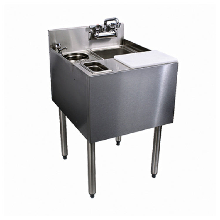 The Glastender C-MFT-20 CHOICE Underbar Mixology Unit is a commercial-grade, free-standing underbar sink designed for precise workflow integration in beverage service environments. Constructed entirely of stainless steel for durability and ease of cleaning, this unit features a 20-inch width and 24-inch depth, supporting efficient mixing and prep tasks. It includes a 9-1/4-inch wide x 11-1/2-inch front-to-back x 6-inch deep bowl, splash-mounted faucet, and a lift-out plastic perforated sink strainer. Its robust stainless steel top, front, ends, and legs make it suitable for high-use settings, ensuring long-term resistance to corrosion and structural integrity during intensive operations.