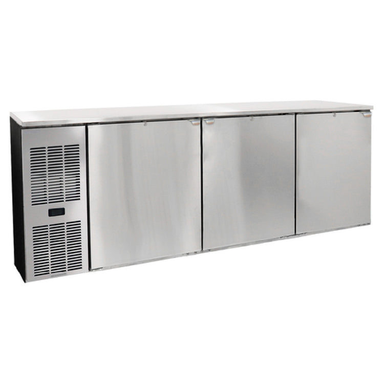 The Glastender C1FL84-UC Cooler One Zone Front Serviced is a commercial-grade undercounter refrigerator designed for precise food storage in high-demand environments. This 84-inch wide unit features a three-section layout with solid hinged doors, providing efficient cold storage for open food items. Its self-contained refrigeration system with side-mounted compressor and 1/4 HP motor ensures reliable cooling performance. Constructed with a stainless steel interior and stainless steel finished top, it offers durability and easy sanitation, making it suitable for busy restaurant kitchens, catering services, and institutional foodservice operations. The integrated LED interior lighting enhances product visibility while front venting facilitates efficient airflow and maintenance. Equipped with two adjustable stainless shelves per door, the unit maximizes storage capacity within a compact footprint, supporting streamlined workflow and inventory organization.
