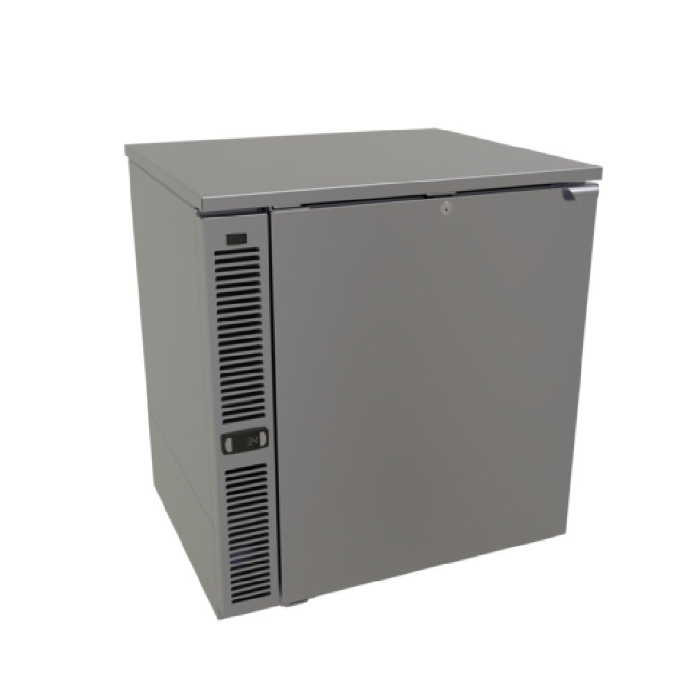 The Glastender C1SL28-UC Cooler One Zone Side Serviced is a commercial undercounter refrigeration unit designed for efficient food storage in professional kitchens. It features a single refrigeration zone with self-contained, side-mounted cooling, measuring 28 inches in width and providing a 20-inch door opening for accessible, organized storage. Constructed with a stainless steel interior and a stainless steel finished top, it ensures durability and easy sanitation. The unit is equipped with LED interior lighting, adjustable shelves for versatile configuration, and a locking stainless pull tab handle for security. Powered by a 1/8 HP compressor using R290 Hydrocarbon refrigerant, it offers reliable performance suitable for busy foodservice environments requiring consistent temperature control within a compact footprint of 28"W x 33.75"H x 24.13"D.