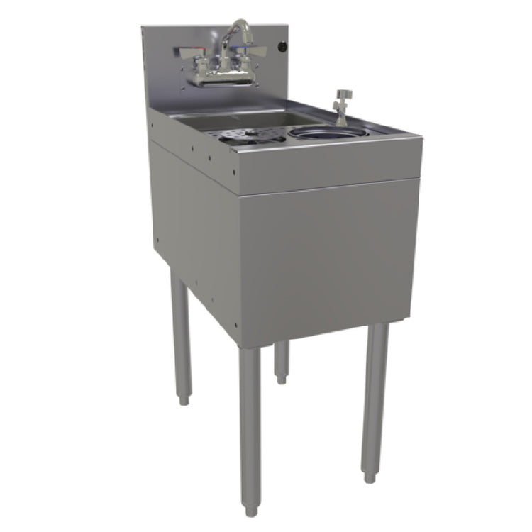 The Glastender MTS-14 Underbar Mixology Unit is a commercial-grade, free-standing underbar sink designed for professional beverage preparation environments. Measuring 14 inches in width and 24 inches in depth overall, this unit features a durable stainless steel construction that guarantees longevity and resistance to corrosion. Its integrated 11-1/2 inch wide by 9-1/4 inch front-to-back bowl with a 6-inch depth caters to high-volume bar operations, providing ample space for liquor bottles, mixing tools, and cleaning tasks. Equipped with a splash-mounted faucet and a lift-out plastic perforated sink strainer, it ensures sanitary workflows and simplifies maintenance. The unit’s robust stainless steel legs with adjustable bullet feet facilitate precise leveling and stability. Designed for restaurant bars, hotels, and catering establishments, this underbar mixology station supports efficient operation with its self-contained setup and food-safe materials, meeting high sanitation standards for commercial environments.