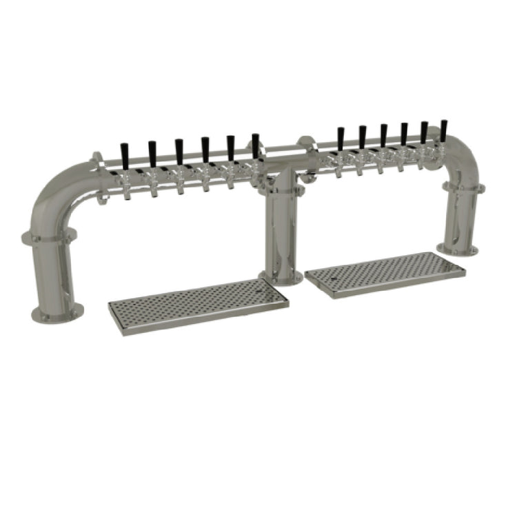 The Glastender PB-12-MF Pipe Bridge Draft Dispensing Tower is a commercial-grade countertop beverage dispensing system designed for high-demand foodservice environments. Constructed entirely from durable stainless steel with a mirror finish, this tower features (12) polished stainless steel faucets (handles not included) mounted on a 63.25-inch wide, 18.5-inch high, and 12-inch deep unit. Equipped with three 4-inch columns and surface-mounted drain pans with removable perforated inserts, it ensures efficient drainage and sanitation. The air-cooled design eliminates water hookup requirements, making it suitable for busy bars, restaurants, and hospitality venues seeking reliable, maintenance-friendly draft beer and wine dispensing solutions. Specifically engineered for moderate throughput, it optimizes workflow with precise, professional-grade components that streamline beverage service.