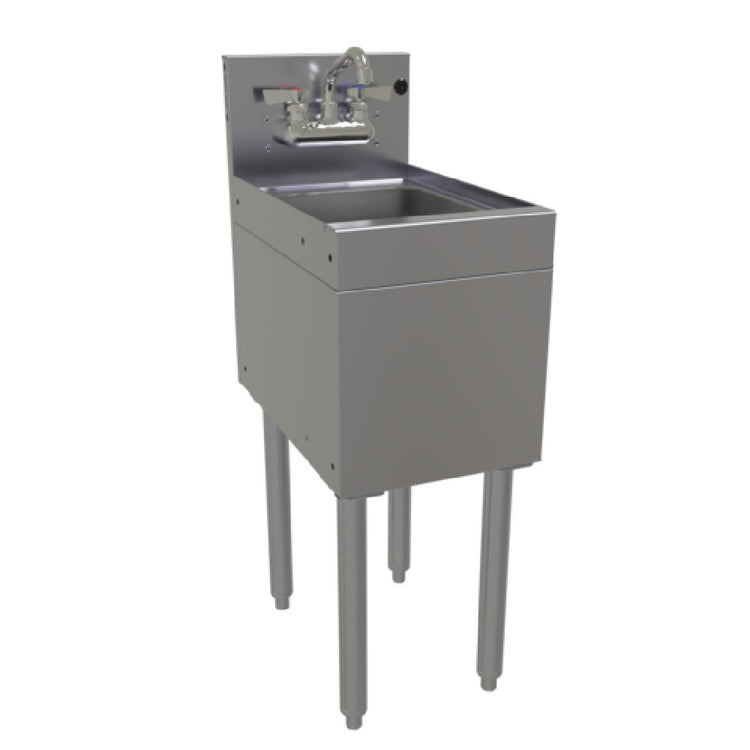 The Glastender SWA-12 Underbar Wet Waste Sink Unit is a commercial-grade stainless steel waste management solution designed for foodservice environments requiring efficient drainage and sanitation. Featuring a 12" wide by 19" deep construction, it includes a 9 1/4" x 11 1/2" x 6" deep bowl with a splash mount faucet (low lead compliant) and a lift-out plastic perforated sink strainer, facilitating easy waste disposal and water drainage. Built with durable stainless steel and equipped with legs and adjustable bullet feet, this unit ensures stability and long-term performance in busy kitchens and bar areas. It is engineered to meet sanitation standards, with ETL sanitation approval and NSF/ANSI 61 compliance, making it suitable for high-use commercial facilities such as bars, restaurants, and catering operations.