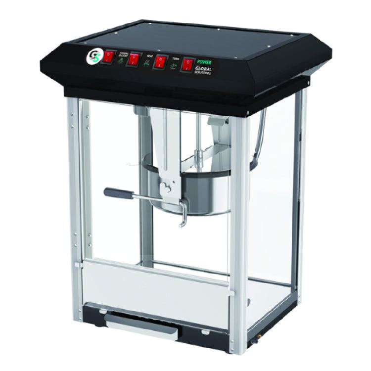 A commercial popcorn popper is a specialized countertop appliance used in high-volume snack production facilities, theaters, and concession stands. It features a durable metal kettle, efficient heating elements, and safety certifications to meet foodservice standards. The GS1735 model by Global Solutions is a compact, reliable unit equipped with a stainless steel kettle and tempered glass sides, ideal for moderate throughput needs in foodservice environments. It supports quick, consistent popping for service in busy settings, making it a versatile choice for snack operations and hospitality venues seeking automated popcorn preparation.