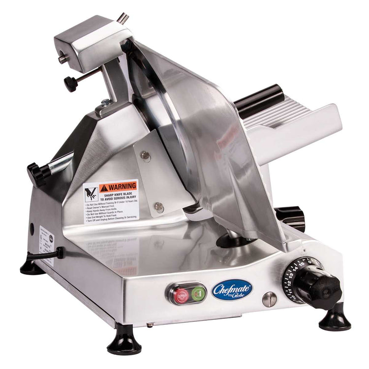 The Globe C12 (QUICK SHIP) Chefmate™ Food Slicer is a professional-grade manual food slicing equipment designed for commercial kitchens and foodservice operations requiring precise, consistent cuts. Featuring a 12-inch diameter serrated knife, the slicer allows adjustable slice thickness ranging from 0" to 9/16", accommodating a variety of food types and portioning needs. Constructed from durable anodized aluminum and belt-driven for reliable performance, this model is equipped with a removable gravity feed chute, top-mounted sharpener, slice deflector, and knife cover. Its ball bearing chute slide system and rubber feet enhance stability and ease of maintenance, making it suitable for mid-volume food processing in restaurants, delis, and butcher shops. The unit operates at 1/3 HP, with electrical specifications of 115V/60Hz, drawing 3 amps, and complies with ETL-Sanitation standards, ensuring sanitation and safety standards are met in high-use environments.