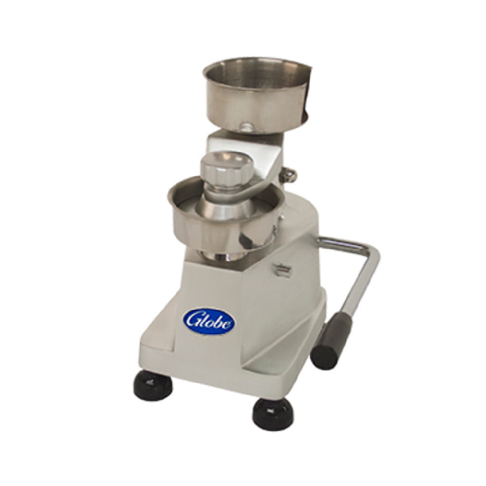 Globe PP4 (QUICK SHIP) Patty Press stands out with its durable anodized aluminum base and stainless steel components, providing longevity and ease of maintenance. Its manual operation eliminates complex setup, enabling quick patty formation, while compact design maximizes countertop space. This model supports consistent burger portions, improving workflow efficiency compared to similar units, making it highly suitable for diverse commercial kitchens seeking reliable meat forming equipment.